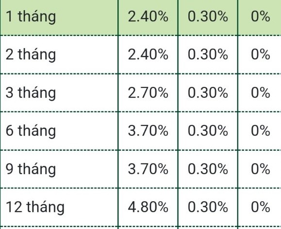 Theo đó, lãi suất ngân hàng kỳ hạn 1 tháng còn 3,3%/năm, kỳ hạn 2 tháng còn 3,5%/năm, kỳ hạn 3 tháng còn 3,6%/năm, kỳ hạn 4 và 5 tháng còn 3,7%/năm.