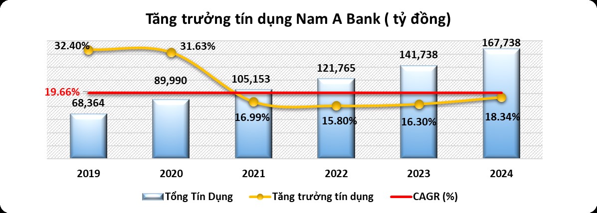 Trong năm 2024, hoạt động tín dụng của Nam A Bank đạt gần 168,000 tỷ đồng, tăng 18.34% so với đầu năm.