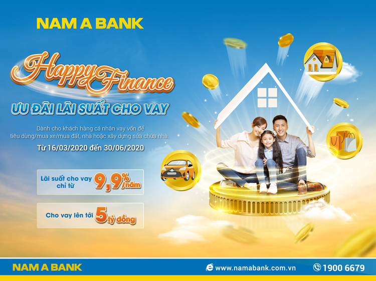 Bên cạnh đó nhằm mục đích tiếp tục đồng hành với khách hàng trong việc phòng chống đại dịch Covid-19, Nam A Bank triển khai chương trình ưu đãi lãi suất cho vay “Happy Finance” từ nay đến 30/06/2020. Chương trình áp dụng đối với các khách hàng cá nhân vay vốn để phục vụ mục đích tiêu dùng, mua xe, mua đất/nhà hoặc xây dựng sửa chữa nhà với lãi suất ưu đãi chỉ từ 9,9%/năm, mức vay tối đa 5 tỷ đồng/khách hàng, thời hạn vay tối thiểu 36 tháng.
