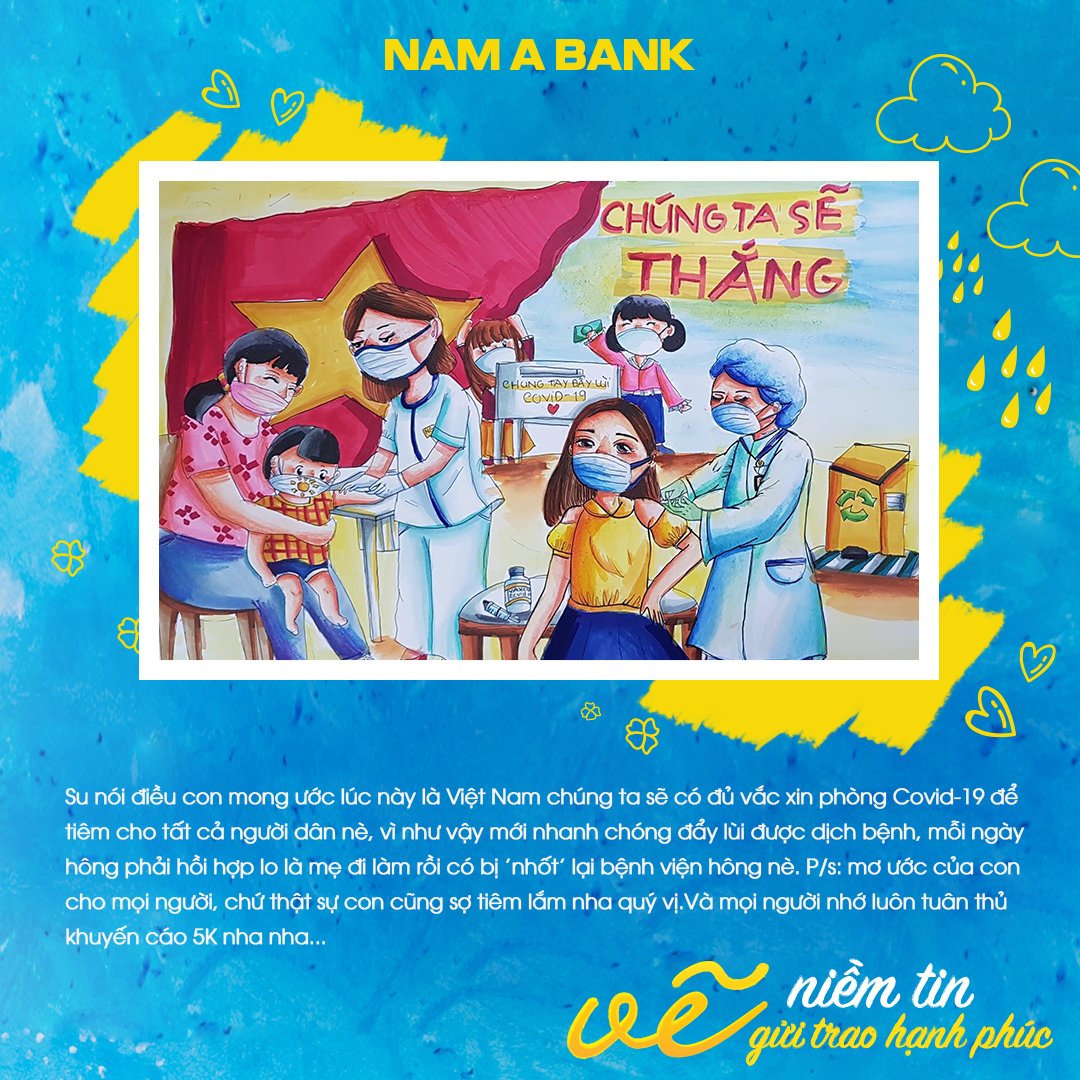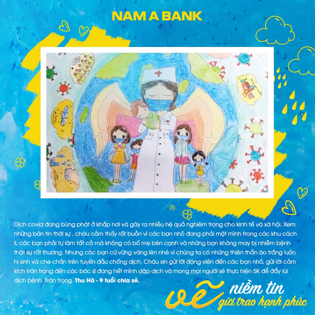 Ngày 10/6, Nam A Bank phát động cuộc thi vẽ tranh ủng hộ tuyến đầu chống dịch với chủ đề “Vẽ niềm tin - Gửi trao hạnh phúc”. Chỉ sau vài ngày phát động, cuộc thi đã nhận được hàng trăm bức tranh của các em thiếu nhi trên cả nước nhằm thể hiện những cảm nhận, suy nghĩ, tình cảm, tri ân đối với các y bác sĩ tuyến đầu chống dịch và góp phần tiếp thêm động lực, tinh thần cho đội ngũ y bác sĩ sớm hoàn thành nhiệm vụ.