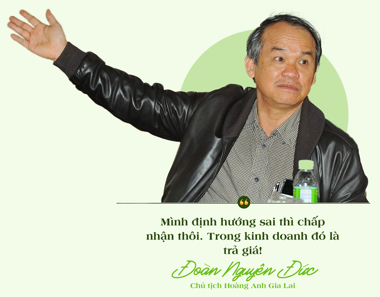 Ông Đức cho biết: "Ban đầu khi quyết định đầu tư vào nông nghiệp, HAGL chọn phát triển cây công nghiệp, gồm cao su và cọ dầu. Sau 5 năm đi sâu vào hai cây đó, nhìn lại thì tôi thất bại. Thất bại là bởi giá của thị trường biến động quá lớn, chứ không phải cây sai. Như giá của cao su chẳng hạn, từ 5.000 USD/ tấn hạ xuống còn 1.300 USD/ tấn thôi. Hạ thấp đến 400% đấy. Cọ dầu tương tự, giá cũng bị xuống.