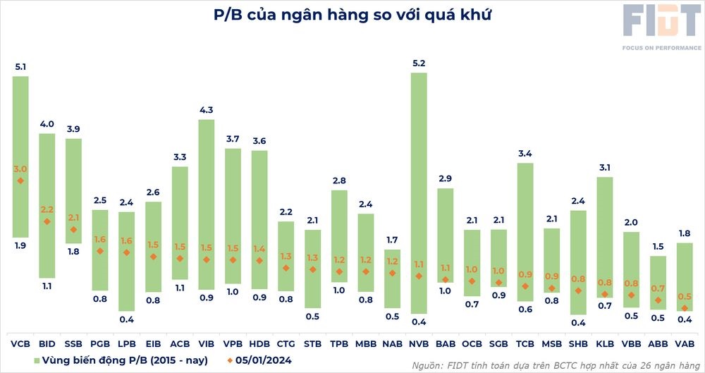 Về định giá, với đà giảm từ của thị trường từ tháng 9/2023 đã đẩy định giá của hầu hết cổ phiếu/nhóm ngành về mức thấp trong lịch sử (kể từ 2012). Cùng với bất động sản, ngân hàng là một trong 2 nhóm ngành có vốn hóa lớn nhất thị trường và đều có định giá nằm ở biên dưới của vùng biến động P/B của ngành.