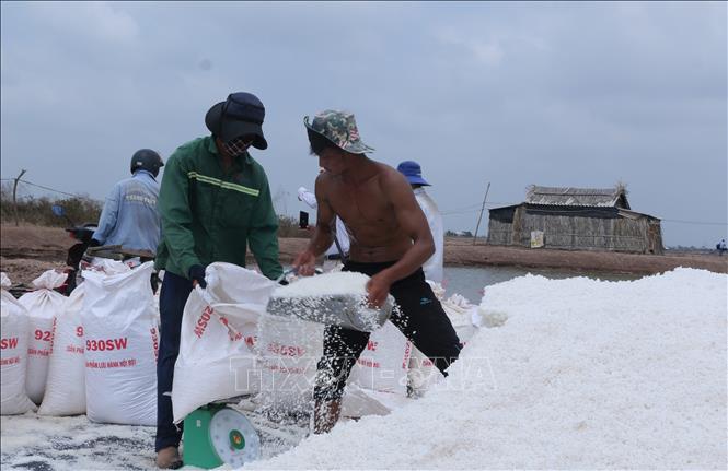 Trên cánh đồng muối xã Long Điền Đông, huyện Đông Hải, những ngày này, diêm dân đang tất bật thu hoạch muối. Nắng to, gió mạnh là điều kiện thuận lợi để muối kết tinh nhanh, rút ngắn thời gian thu hoạch. Giá muối trắng bán tại ruộng hiện từ 800 - 1.000 đồng/kg (giảm 200 - 400 đồng/kg) so với đầu vụ. Mặc dù giá sụt giảm nhưng diêm dân vẫn có lãi, do sản lượng cao.