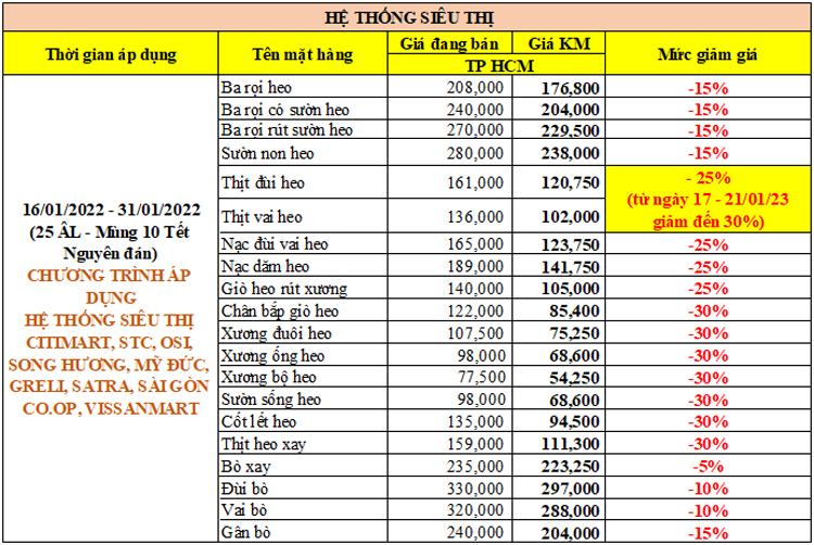 Đối với ngành hàng tươi sống, Công ty VISSAN cũng giảm giá các mặt hàng thực phẩm tươi sống, thịt heo thiết yếu tại các hệ thống siêu thị và cửa hàng VISSAN (áp dụng tại TP.HCM). Chương trình khuyến mãi giảm giá từ 5% đến 40% từ ngày 14/01/2023 đến hết ngày 31/01/2023 (tức 21 âm lịch – Mùng 10 Tết Nguyên Đán). Đặc biệt, từ ngày 17 – 21/01/2023 giảm giá sốc 30% cho sản phẩm thịt đùi heo và thịt vai heo. Chi tiết chương trình: