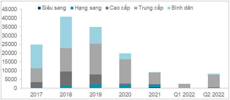 Nhờ sự phục hồi kinh tế và sự thay đổi nâng cao mức sống của mọi người, tỷ lệ những hộ trung lưu tại TPHCM cũng đã gia tăng. Các nhà đầu tư đã thích ứng kịp thời để “linh hoạt” đẩy mạnh cung cấp các sản phẩm phù hợp để đáp ứng được nhu cầu cho các hộ này. Đối với nhu cầu, số lượng căn hộ bán ra trong quý 2/2022 đạt 9,048 căn, gần bằng với số lượng bán của cả năm 2021 là 10,145 căn. Riêng thị trường nhà phố bán được 173 căn (giảm 10 căn so với quý 1) và biệt thự giảm một nửa so với quý trước với 45 căn được giao dịch.
