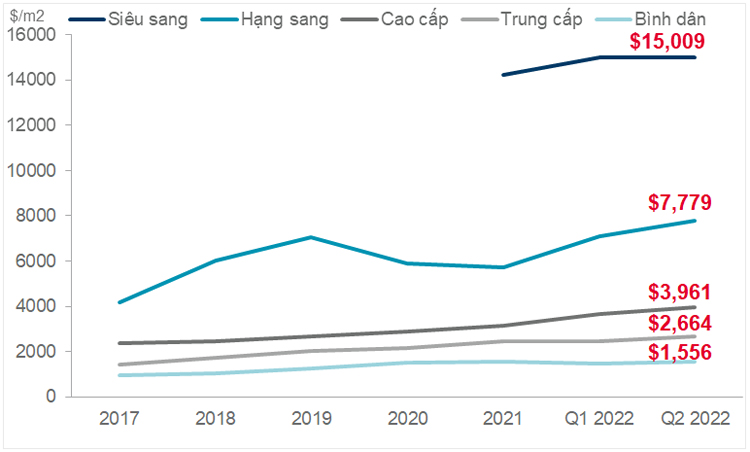 Giá bán căn hộ quý 2/2022 dao động từ mức trung bình thấp nhất là 1,556 USD trên một mét vuông (tương đương 36 triệu đồng) đến trung bình cao nhất đạt 15,009 USD trên mỗi mét vuông (tương đương 348 triệu đồng). Đối với các dự án biệt thự và nhà phố có mức giá lần lượt là 11,000 USD trên một mét vuông (tương đương 255 triệu đồng) và 9,300 USD trên một mét vuông (tương đương 216 triệu đồng).