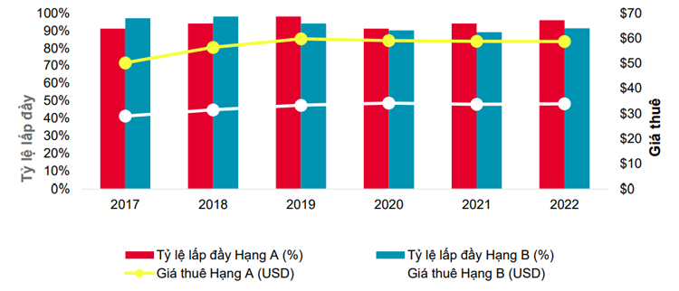 Biểu đồ tỷ lệ lấp đầy và giá thuê của văn phòng hạng A và B
