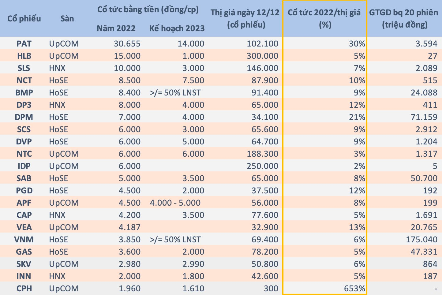 Các doanh nghiệp có truyền thống chi trả cổ tức cao hàng năm gồm nhiều cái tên quen thuộc như Vianmilk (VNM), Sabeco (SAB), Nhựa Bình Minh (BMP), PV Gas (GAS), VEAM Corp (VEA), Dược phẩm Trung ương 3 (DP3),… Một số trường hợp như Phốt pho Apatit Việt Nam (PAT), Mía đường Sơn La (SLS), Bia Hạ Long (HLB) còn chia cổ tức với tỷ lệ lên đến hàng trăm % năm 2022.