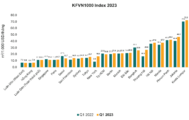 Đây là năm thứ hai liên tiếp chỉ số KFVN1000 của Knight Frank biểu thị diện tích văn phòng Hạng A có thể thuê được mỗi tháng với 1.000 USD tại 21 thành phố trên khắp thế giới. Theo đó, ở khu vực Châu Á-Thái Bình Dương, Tp.HCM có giá thuê văn phòng cao chỉ sau Hồng Kông (nơi 1.000 USD thuê được 7 m2), Singapore (11,4 m2), Seoul (13,7 m2), Sydney (14,3 m2) và Tokyo (15,7 m2).