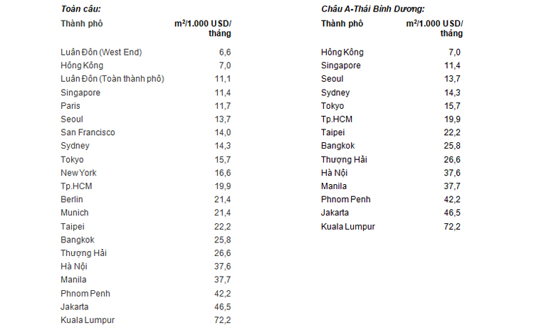 Tại Tp.HCM, với 1.000 USD mỗi tháng khách thuê sẽ được sử dụng 19,9 m2 diện tích văn phòng cao cấp. Ở bình diện toàn cầu, thành phố đứng thứ 12 về giá thuê văn phòng, chỉ sau New York.