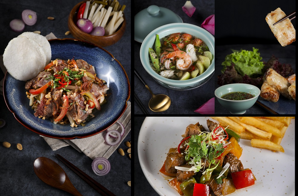 Một số món Việt truyền thống được giới thiệu trong thực đơn phải kể đến phở bò hoặc gà, canh chua hải sản, bò kho, và miến xào cua. Phần ẩm thực Ý, thực khách có thể thưởng thức những món nổi tiếng như Zuppa di pesce (Súp hải sản, tỏi, ớt, cà chua bi và dầu ô liu thượng hạng), Ossobuco(Bắp bê, cơm nghệ tây và sốt gremolata), Cartoccio (Mì Linguine với mực, tôm, nghêu), Fettuccine (Mỳ dẹt Ý, sốt bò bằm và phô mai parmesan), hay món tráng miệng Panna cotta yêu thích.