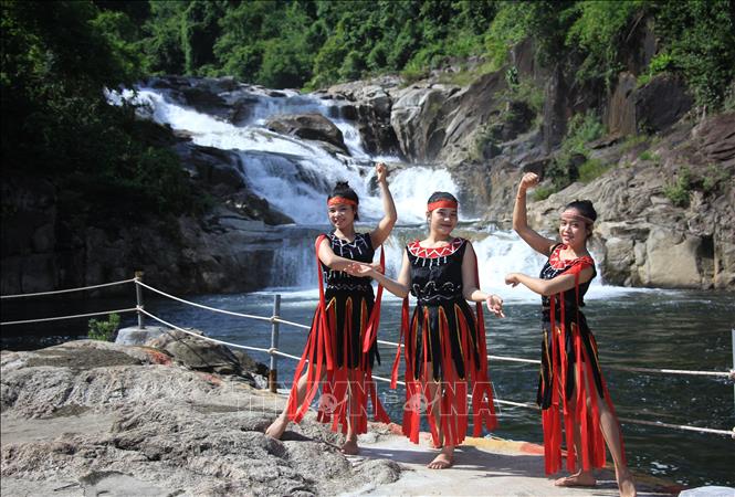 | Thôn nữ trong trang phục dân tộc người Raglai bên dòng thác Yang Bay. |
