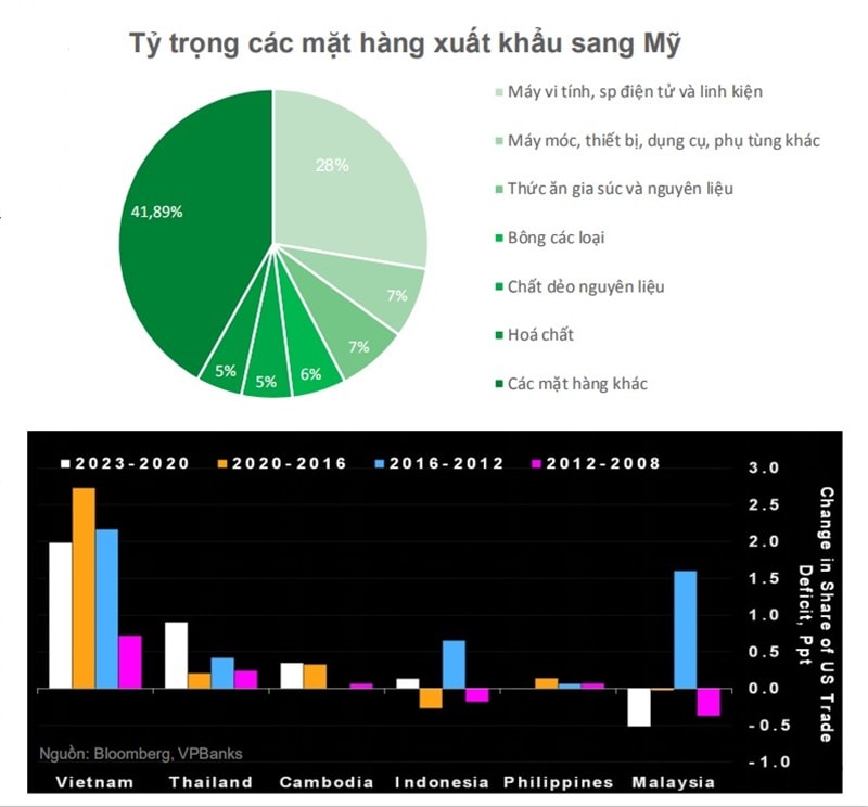 Tuy nhiên, theo đánh giá của VPBankS, nhìn lại thời kỳ ông Trump làm Tổng thống ở nhiệm kỳ đầu tiên (Trump 1.0), Việt Nam là số ít trong các quốc gia tại khu vực Đông Nam Á hưởng lợi trong cuộc chiến thương mại Trade war 1.0 do ông khởi xướng. VPBankS cho rằng nếu ông Trump tiếp tục thắng cử và Mỹ áp đặt thuế 60% đối với Trung Quốc, Việt Nam có thể gia tăng thị phần xuất khẩu sang Mỹ, nhờ lợi thế về các mặt hàng mà Mỹ đã áp thuế với Trung Quốc, dựa trên chiến lược ‘’Trung Quốc +1” của các nhà đầu tư. Bên cạnh đó, lĩnh vực BĐS khu Công nghiệp có thể hưởng lợi nhờ làn sóng chuyển nhà máy tiếp tục tăng mạnh theo dòng vốn FDI.