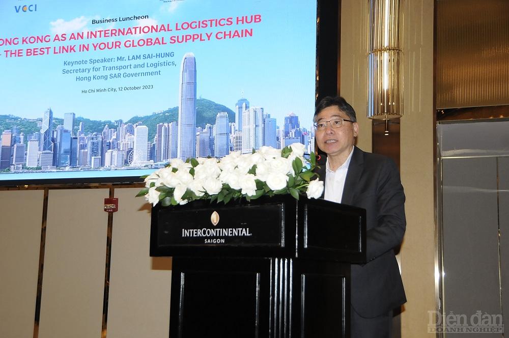 “Là một trung tâm thương mại và logistics quốc tế, Hồng Kông tiếp tục đóng vai trò là cửa ngõ lý tưởng giữa Trung Quốc đại lục và thế giới, trong đó có Việt Nam. Vào năm 2022, khoảng 23 tỷ đô la giá trị thương mại giữa Trung Quốc đại lục và Việt Nam được thực hiện thông qua Hồng Kông, chiếm khoảng 9% tổng kim ngạch thương mại giữa Trung Quốc đại lục và Việt Nam”, Bộ trưởng Bộ GTVT và Logistics Hong Kong Lam Sai Hung cho biết.
