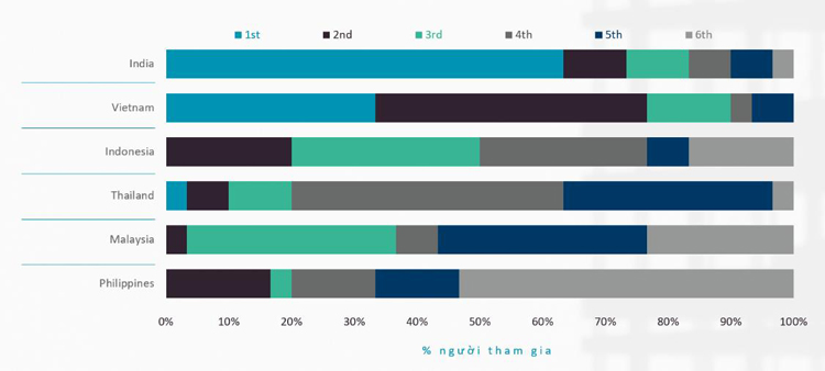 | Việt Nam chiếm gần 80% số phiếu bầu cho hai vị trí ưu tiên, theo sau là 75% cho Ấn Độ. Nguồn: Cushman & Wakefield |