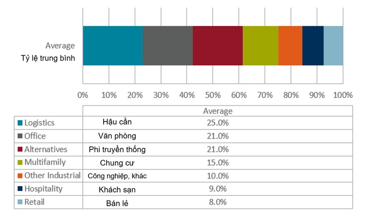 Cuộc khảo sát cũng dò hỏi tâm lý nhà đầu tư sẽ đầu tư vào phân khúc nào với 1 tỷ đô la trong tay, 25% các nhà đầu tư cho biết sẽ triển khai vốn vào phân khúc Logistics, theo sau đó là các phân khúc văn phòng và phi truyền thống như Trung tâm dữ liệu (data center) và nhà ở đa gia đình.