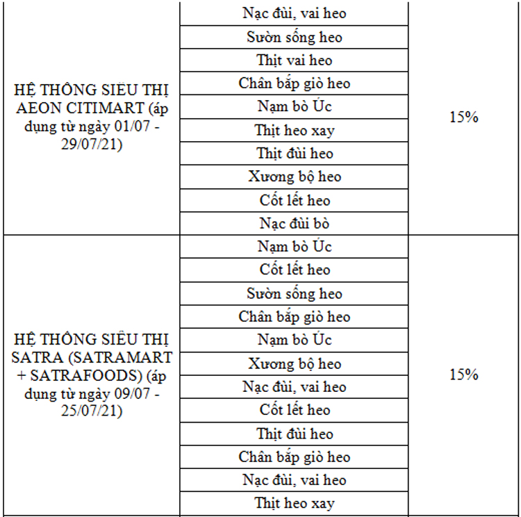Theo đó, công ty VISSAN giảm giá từ 10 - 20% các mặt hàng Thịt Heo VietGAP và Thịt Bò Úc như: Ba rọi rút sườn, Sườn non, Nạc dăm, Cốt lết heo, Nạc đùi Bò, Nạc vai Bò…