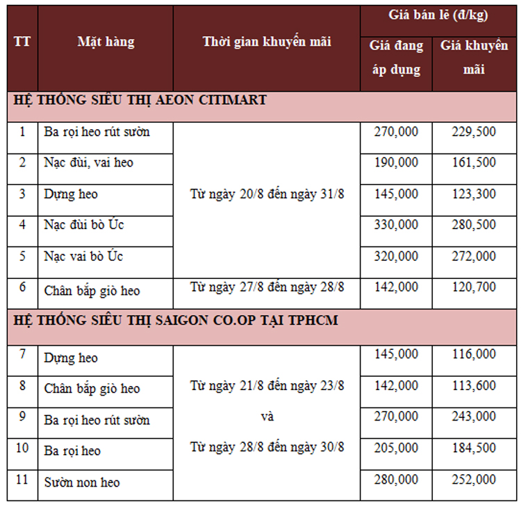 Ngoài ra, Vissan sẽ triển khai chương trình giảm giá một số mặt hàng thịt heo VietGAP gồm: Thịt heo xay, Ba rọi heo, Sườn non heo, Ba rọi heo rút sườn, Cốt lết heo và Dựng heo. Chương trình được áp dụng từ ngày 24/8 đến ngày 31/8 cho tất cả khách hàng khi mua trực tiếp tại hệ thống cửa hàng giới thiệu sản phẩm Vissan (http://www.vissan.com.vn/he-thong-phan-phoi), đặt mua online trên NOW và SENDO hoặc gọi Hotline 1900 1960 để được tư vấn và mua hàng nhanh chóng.