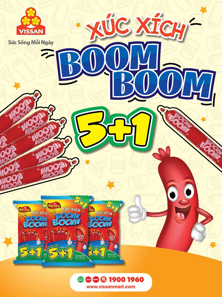 Thấu hiểu sự đam mê của các bé dành cho món Xúc xích, Công ty VISSAN đã nâng cấp sản phẩm Xúc xích tiệt trùng Boom Boom 5+1, để món ăn yêu thích của các bé không chỉ dinh dưỡng, chất lượng mà còn mang nhiều niềm vui. Giờ đây, trong mỗi gói Xúc xích Boom Boom sẽ có 6 cây xúc xích, đã có 5 nay còn thêm 1, vị thêm đậm đà, niềm vui nhân đôi giúp các bé thưởng thức trọn vẹn hương vị sản phẩm.
